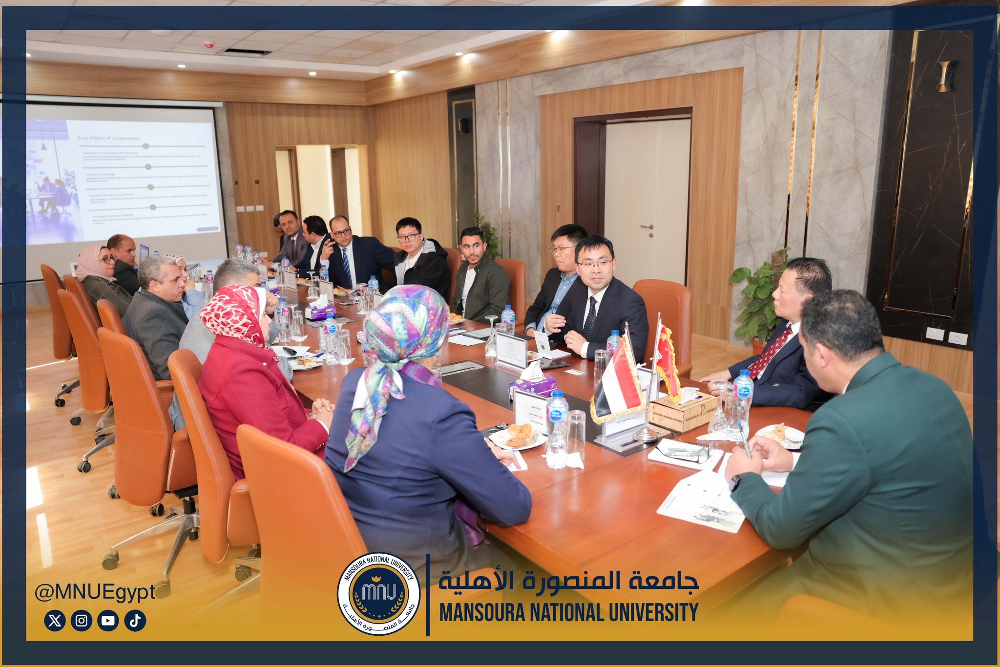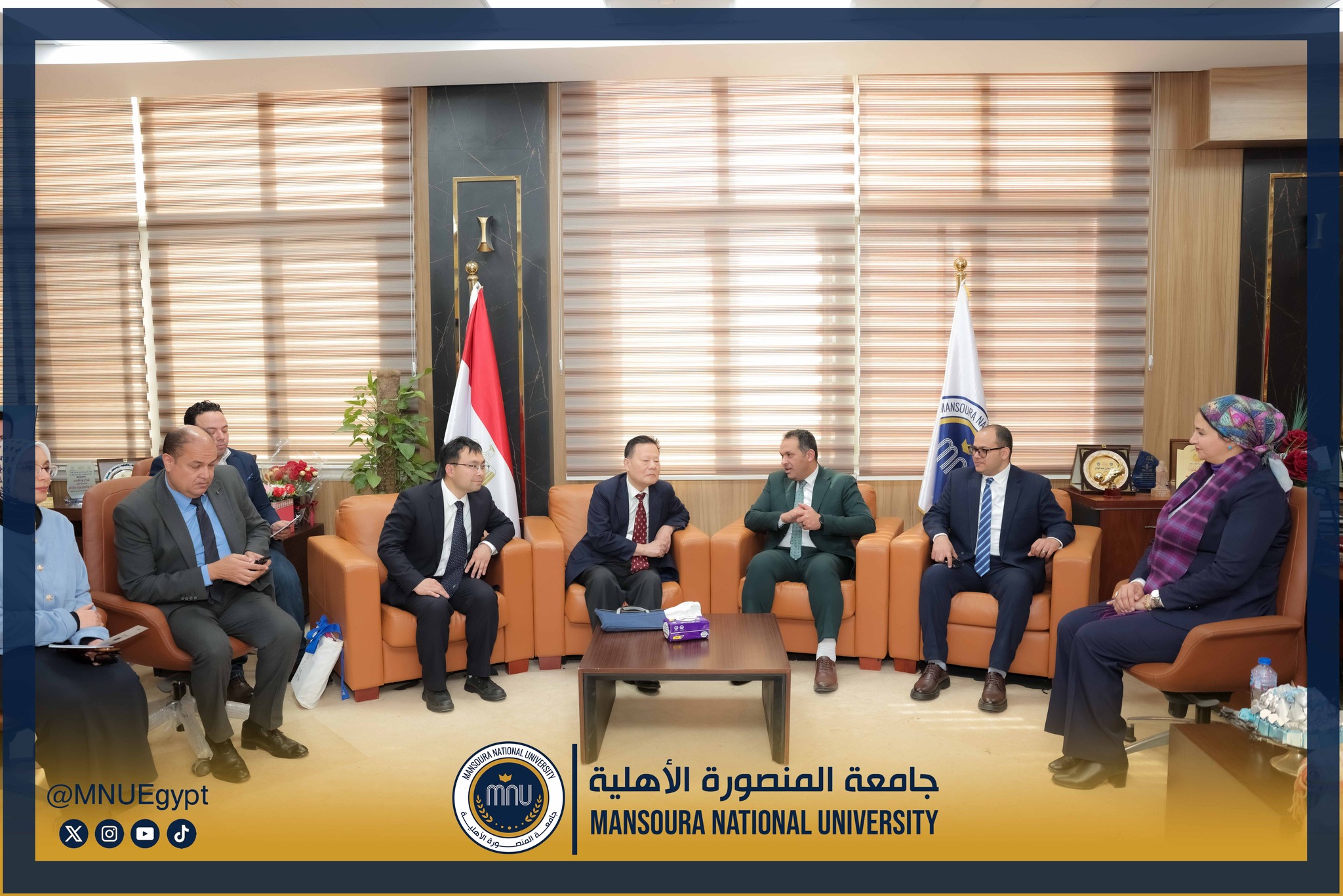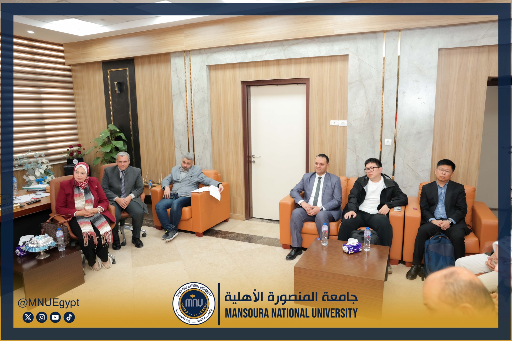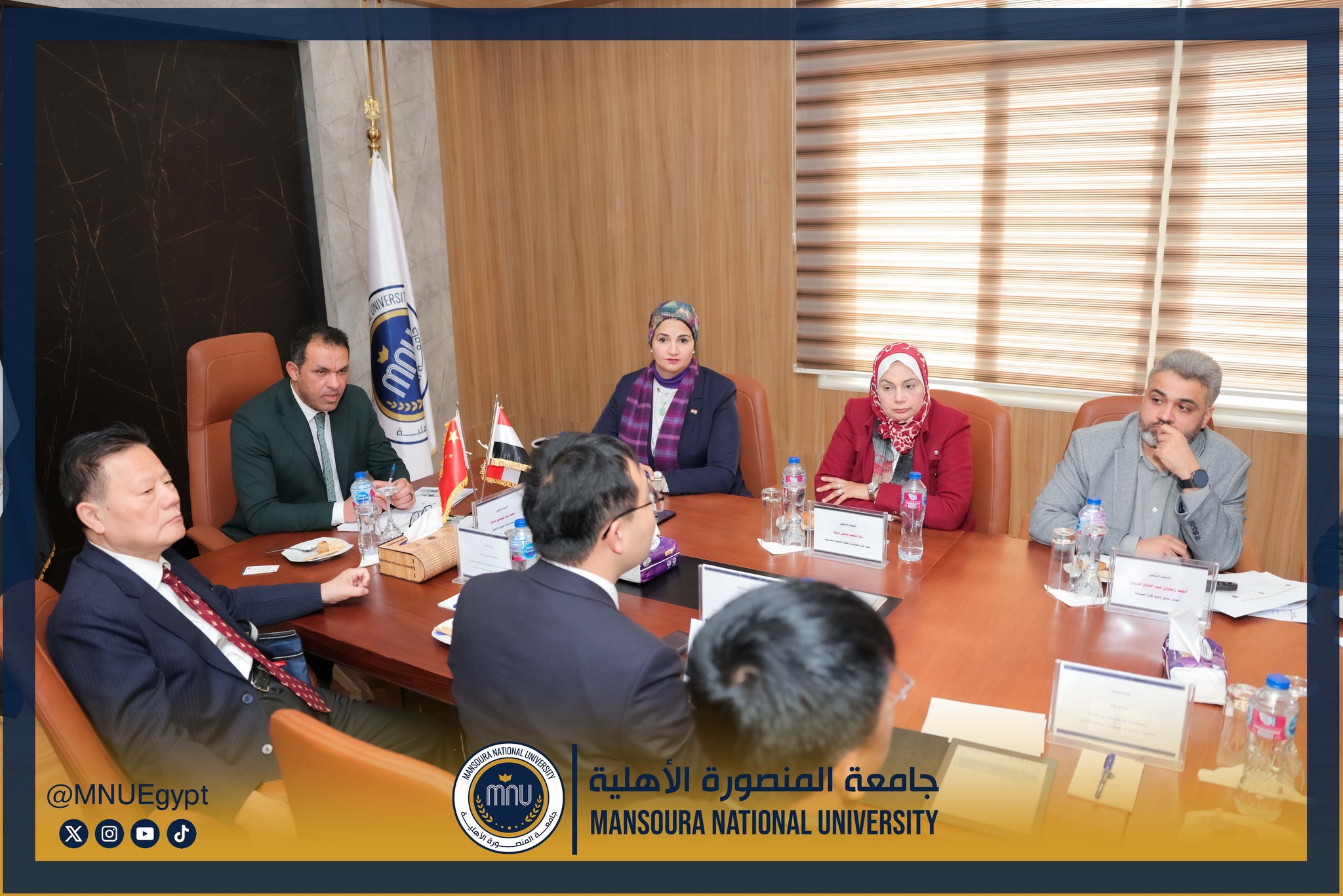 استقبلت جامعة المنصورة الأهلية برئاسة الأستاذ الدكتور محمد عبد العظيم رئيس الجامعة، وفدًا صينيًا رفيع المستوى، وذلك في إطار تعزيز التعاون الدولي وبحث أوجه الشراكة الأكاديمية والبحثية بين الجانبين، بحضور السادة عمداء الكليات ومديري البرامج، بحضور كل من الأستاذة الدكتورة رشا بروة، عميد كلية تكنولوجيا العلوم الصحية، الأستاذة الدكتورة رئيفة علام، عميد كلية التمريض، الأستاذة الدكتورة أميرة طمان، القائم بعمل عميد كلية الطب، الأستاذة الدكتورة نهى الوصيفي، القائم بعمل عميد كلية طب الأسنان، الأستاذ الدكتور أحمد الشيخ، القائم بعمل عميد كلية للصيدلة، الأستاذ الدكتور إيهاب عبد الحي، القائم بعمل عميد كلية الهندسة، الدكتور نبيل عرفات، مدير برامج كلية الاقتصاد والعلوم الإدارية،