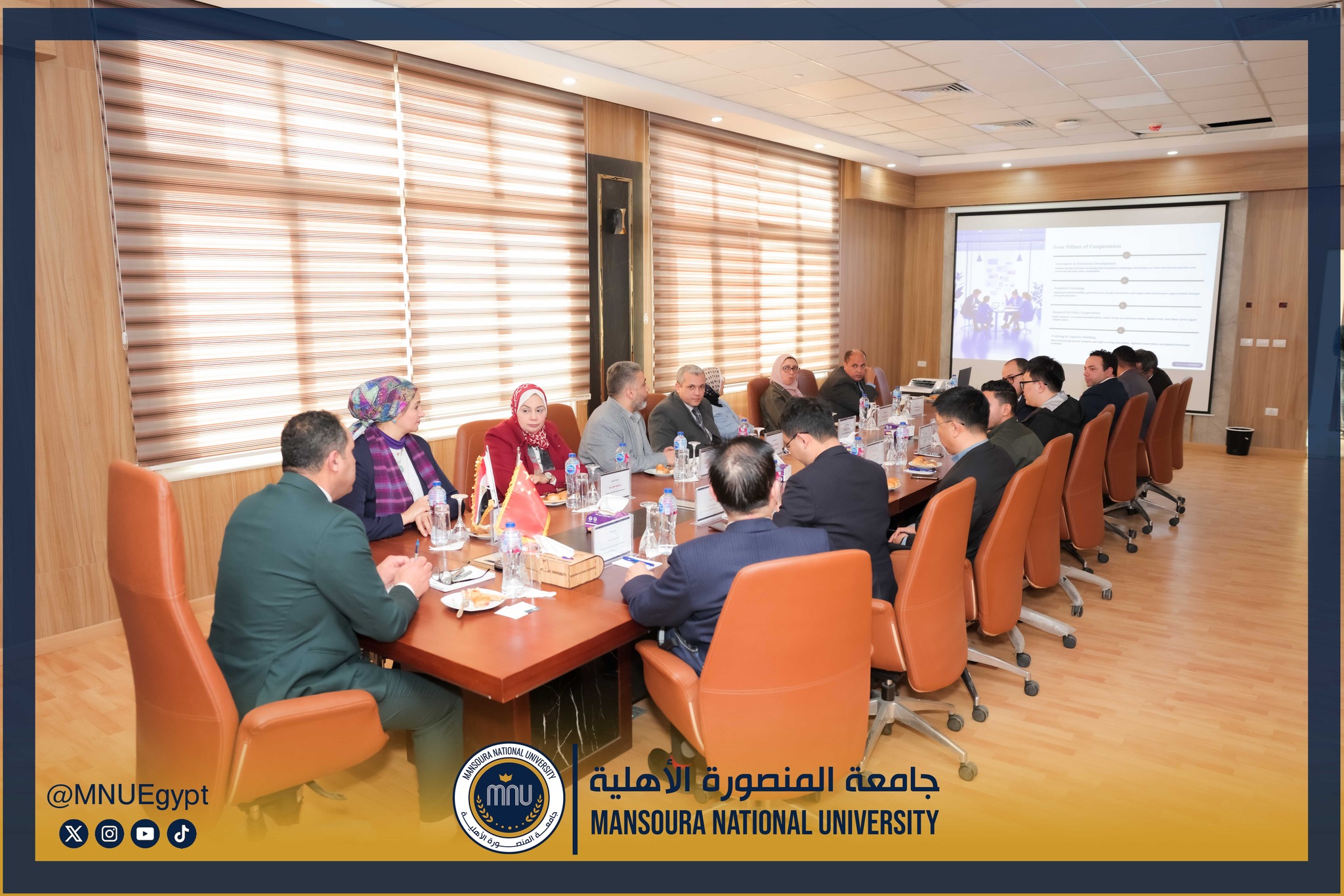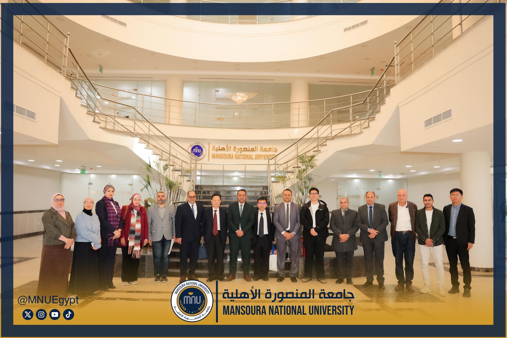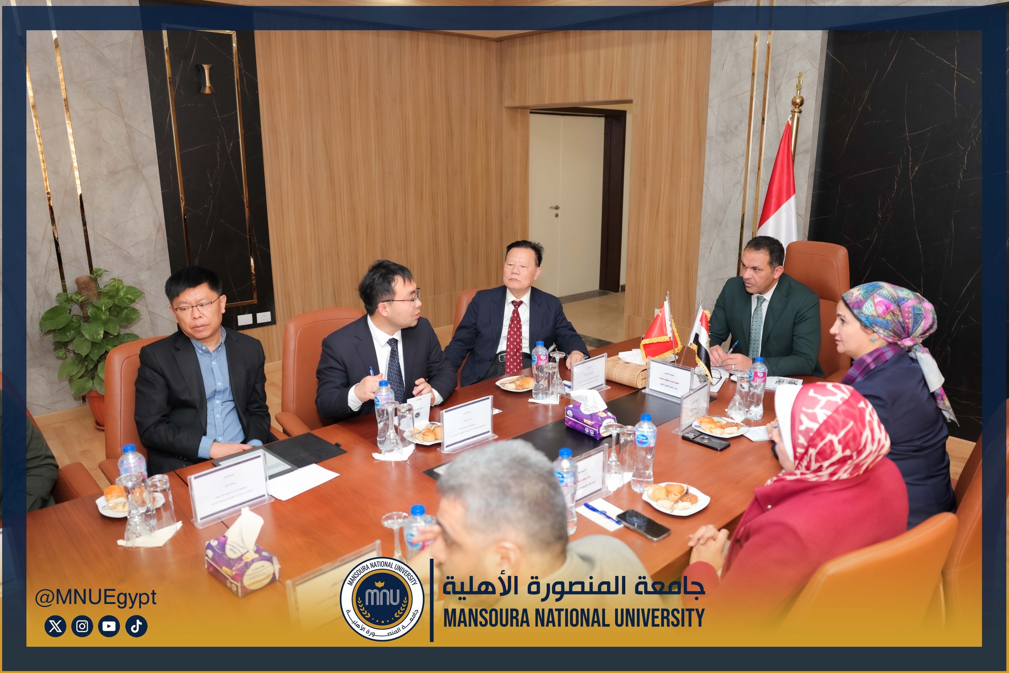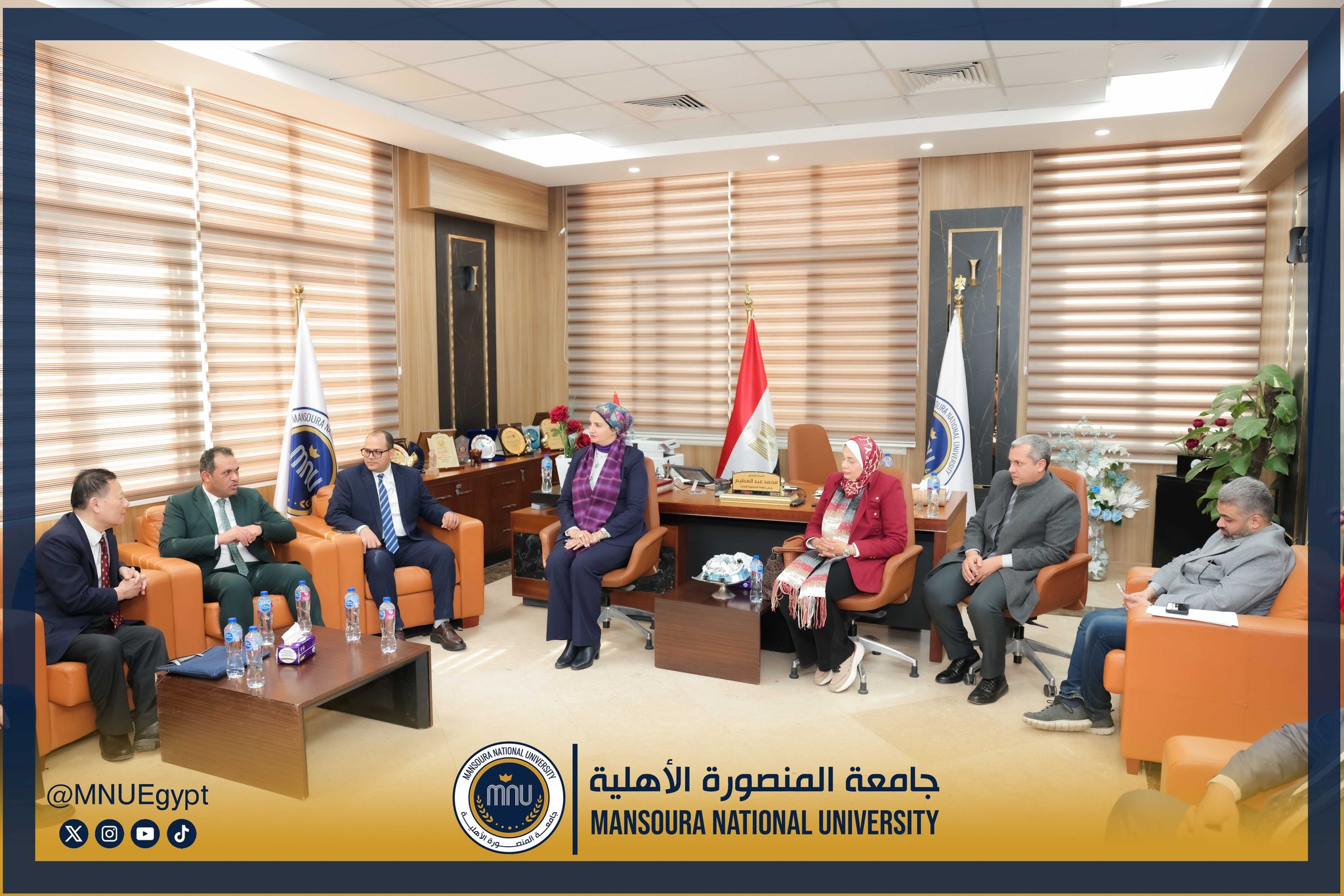 استقبلت جامعة المنصورة الأهلية برئاسة الأستاذ الدكتور محمد عبد العظيم رئيس الجامعة، وفدًا صينيًا رفيع المستوى، وذلك في إطار تعزيز التعاون الدولي وبحث أوجه الشراكة الأكاديمية والبحثية بين الجانبين، بحضور السادة عمداء الكليات ومديري البرامج، بحضور كل من الأستاذة الدكتورة رشا بروة، عميد كلية تكنولوجيا العلوم الصحية، الأستاذة الدكتورة رئيفة علام، عميد كلية التمريض، الأستاذة الدكتورة أميرة طمان، القائم بعمل عميد كلية الطب، الأستاذة الدكتورة نهى الوصيفي، القائم بعمل عميد كلية طب الأسنان، الأستاذ الدكتور أحمد الشيخ، القائم بعمل عميد كلية للصيدلة، الأستاذ الدكتور إيهاب عبد الحي، القائم بعمل عميد كلية الهندسة، الدكتور نبيل عرفات، مدير برامج كلية الاقتصاد والعلوم الإدارية،